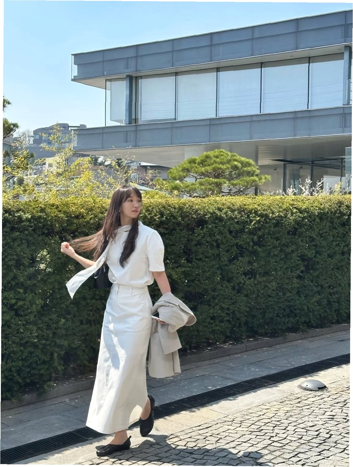 A.옥순은 최근 올화이트룩으로 화사한 봄 패션을 선보였습니다. 화이트 상의와 롱 스커트에 블랙 숄더백과 베이지 톤 재킷을 매치하여 세련된 스타일을 완성했습니다.