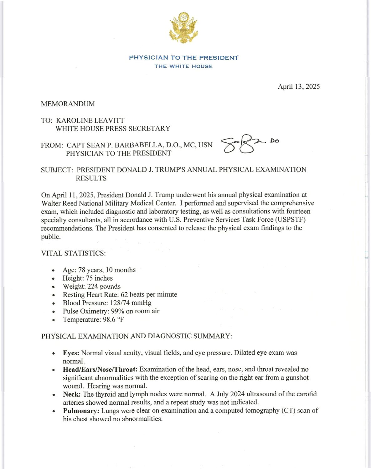 도널드 트럼프 전 미국 대통령이 정기 건강검진에서 '탁월하게 건강하다'는 의사 소견을 받았습니다. 10일(현지시간) AP 통신 등 보도에 따르면, 트럼프 대통령의 주치의인 숀 바바벨라 미 해군 대령은 백악관이 공개한 건강검진 결과 보고서에서 이같이 밝혔습니다. 트럼프는 79세의 고령임에도 불구하고 심혈관, 폐, 신경, 신체 기능 모두 강한 것으로 나타났습니다. 주치의는 트럼프 대통령의 '심장나이'가 실제 나이보다 14년 젊다고 보고했으며, 이는 65세 수준으로 평가된 것입니다.