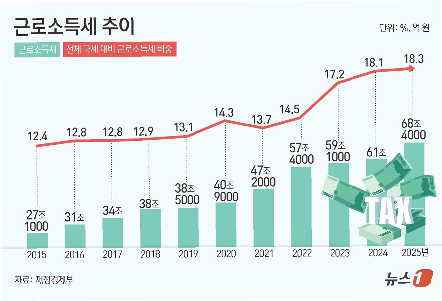직장인 세금 부담, 역대 최대치 기록지난해 직장인 월급에서 원천징수된 근로소득세가 역대 최대인 68조 4000억 원에 달했습니다. 이는 전체 국세 수입의 18.3%를 차지하며, 최근 10년 내 가장 높은 비중입니다. 특히 지난 10년간 전체 국세 수입 증가율(71.6%)보다 2배 이상 높은 152.4%의 증가율을 보이며 직장인들의 세금 부담이 가중되고 있음을 시사합니다. 이러한 추세는 취업자 수 증가와 명목 임금 상승에 따른 것으로 분석됩니다. (출처: 재정경제부) 근로소득세, 다른 세목 대비 가파른 증가세지난 10년간 근로소득세는 27조 1000억 원에서 68조 4000억 원으로 152.4% 급증했습니다. 같은 기간 전체 국세 수입은 71.6% 증가하는 데 그쳤습니다. 법인세 비중은 20.7%에서..